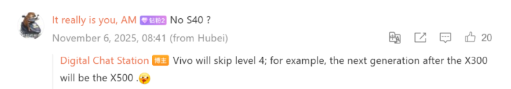 كما هو موضح أعلاه، زعم موقع Digital Chat Station أن الجيل التالي من هاتف X300 سيُطلق عليه اسم X500. هذا يعني أن تشكيلة الجيل القادم قد تشمل هواتف Vivo X500 وX500 Pro وX500 Ultra، كخلفاء لهواتف Vivo X300 و X300 Pro و X300 Ultra الحالية .