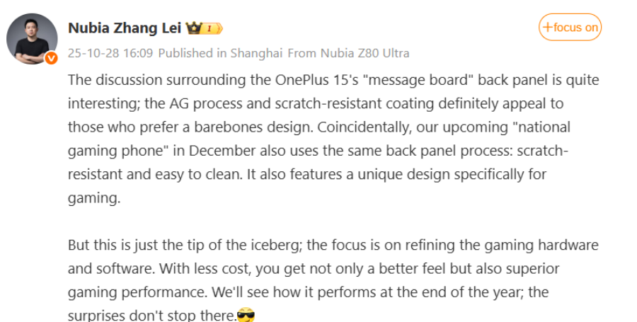 في أكتوبر الماضي، زعم تشانغ لي، نائب رئيس شركة ZTE والمدير العام لمنتجات نوبيا الرئيسية، أن زجاج هاتف OnePlus 15 المقاوم للتوهج والطلاء المقاوم للخدش سيجذبان المستخدمين الذين يفضلون استخدام هواتفهم بدون أغطية. سيأتي الجهاز بسطح مقاوم للخدش يسهل تنظيفه بمسحة واحدة، بالإضافة إلى تصميم مُحسّن خصيصًا للألعاب.
