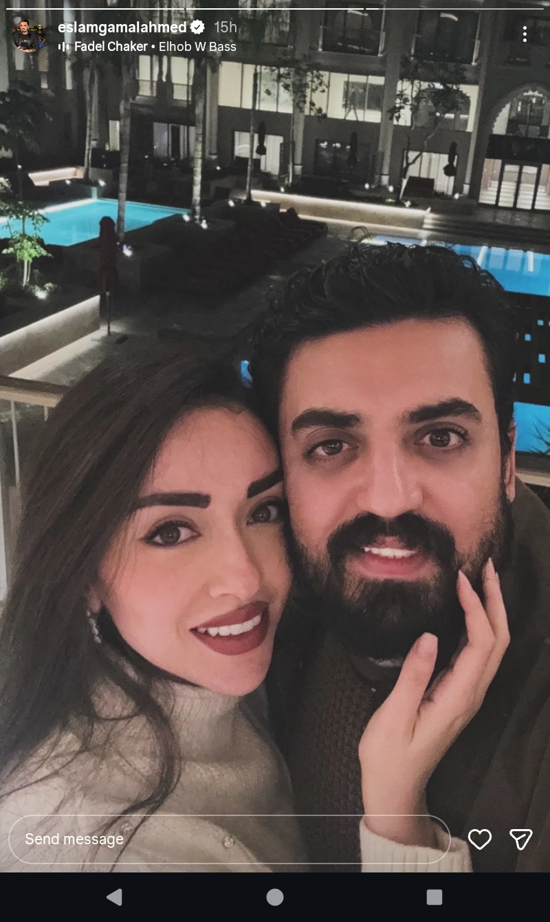 وظهر إسلام جمال في الصورة رفقة زوجته في إطلاله رومانسيه.
