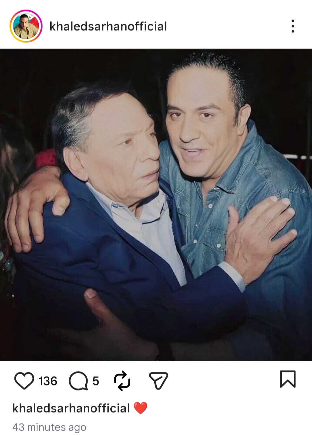 شارك الفنان خالد سرحان جمهوره صورة برفقة الزعيم عادل أمام عبر حسابه الشخصي بموقع التواصل الاجتماعي فيسبوك.