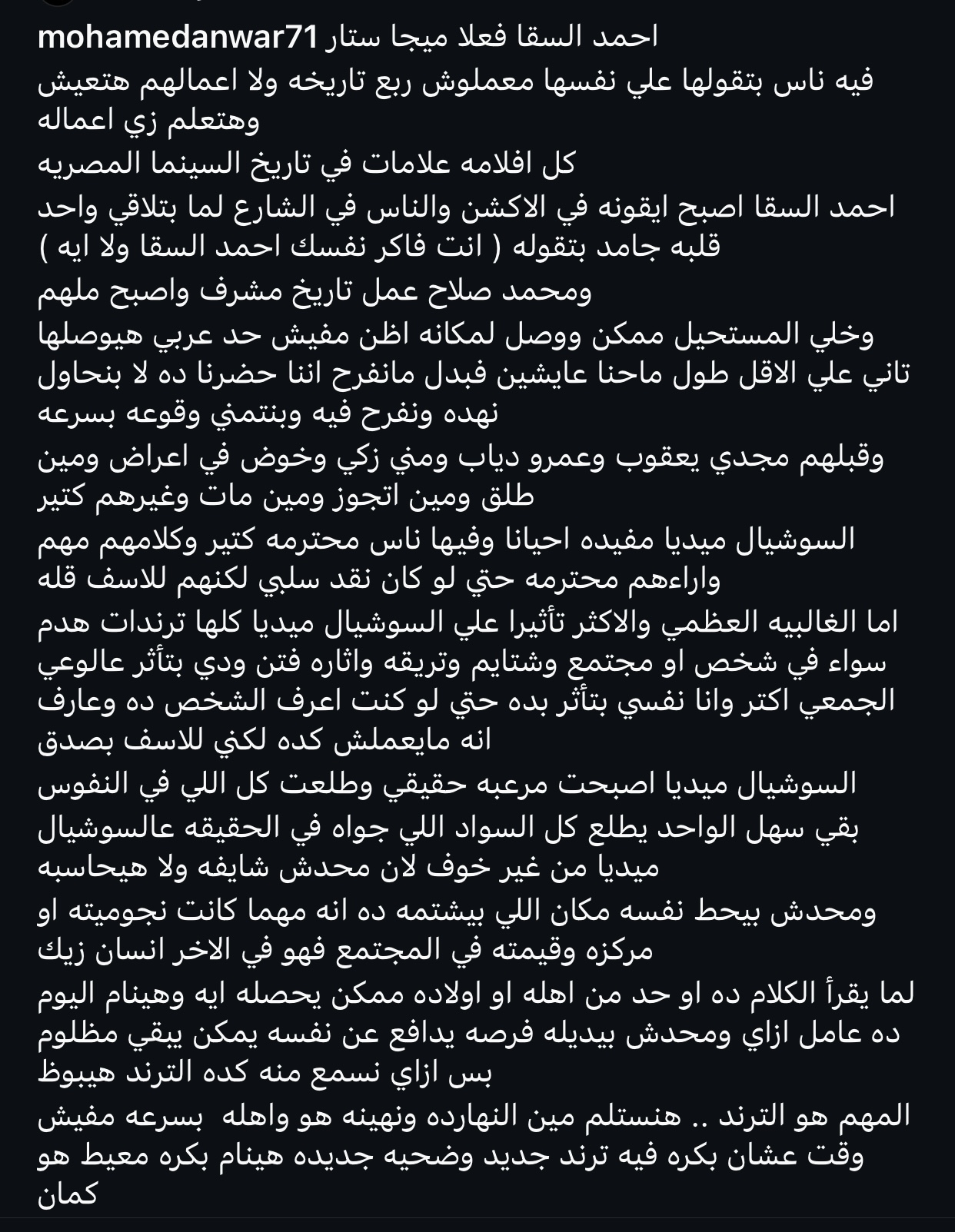 وأردف: “السوشيال ميديا مفيده احيانا وفيها ناس محترمه كتير وكلامهم مهم واراءهم محترمه حتي لو كان نقد سلبي لكنهم للاسف قله اما الغالبيه العظمي والاكثر تأثيرا علي السوشيال ميديا كلها ترندات هدم سواء في شخص او مجتمع وشتايم وتريقه واثاره فتن ودي بتأثر عالوعي الجمعي اكتر وانا نفسي بتأثر بده حتي لو كنت اعرف الشخص ده وعارف
