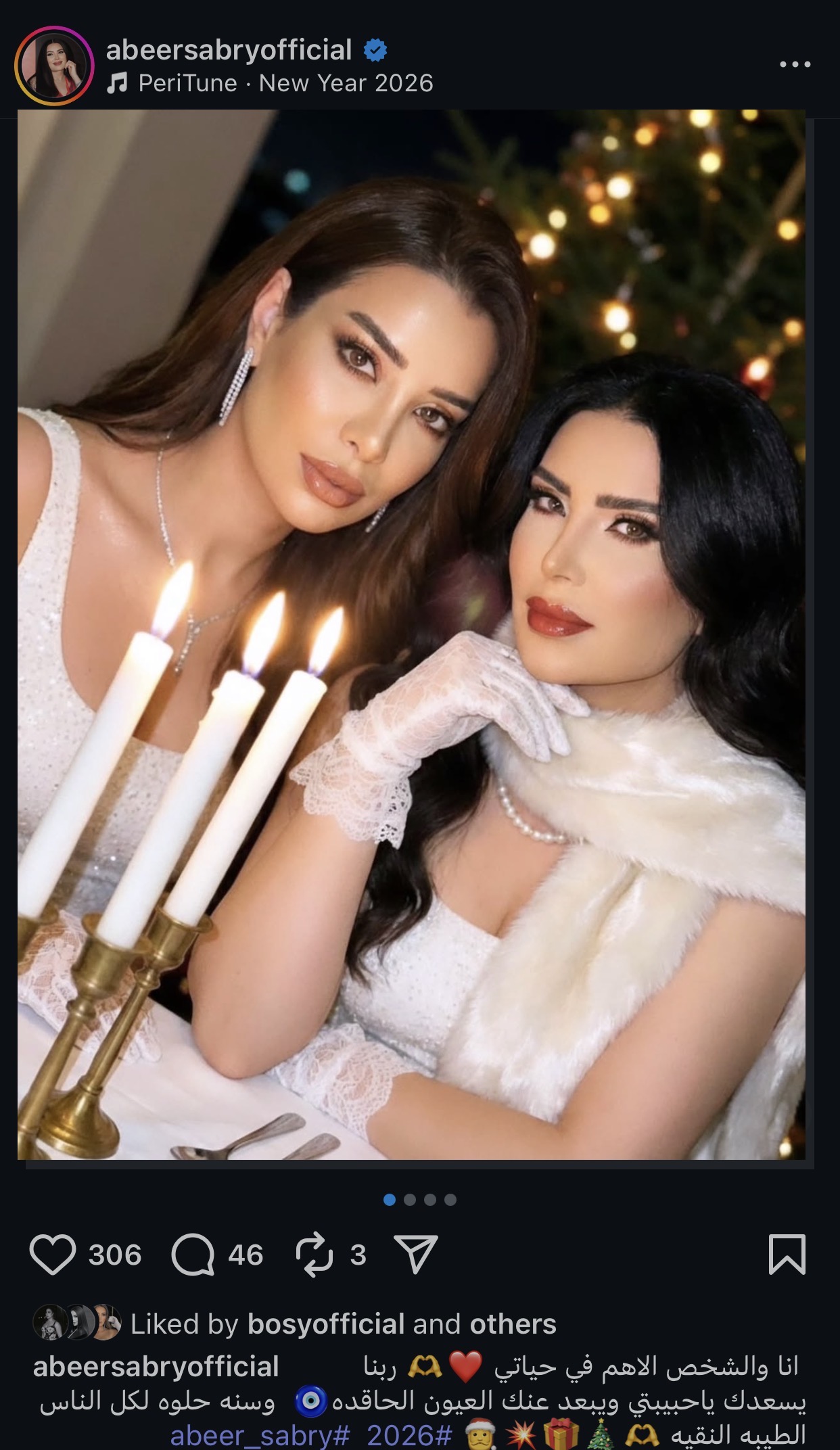 احتفلت الفنانة عبير صبري برأس السنة الجديدة مع شقيقتها الإعلامية مروة صبري ونشرت صورة تجمعهما سويًا عبر حسابها الشخصي بموقع إنستجرام وعلقت عليها قائلة: “أنا والشخص الأهم في حياتي وسنه حلوه لكل الناس، ربنا يسعدك با حبيبتي ويبعد عنك العيون الحاقدة، وسنة حلوة لكل الناس الطيبة النقية”.