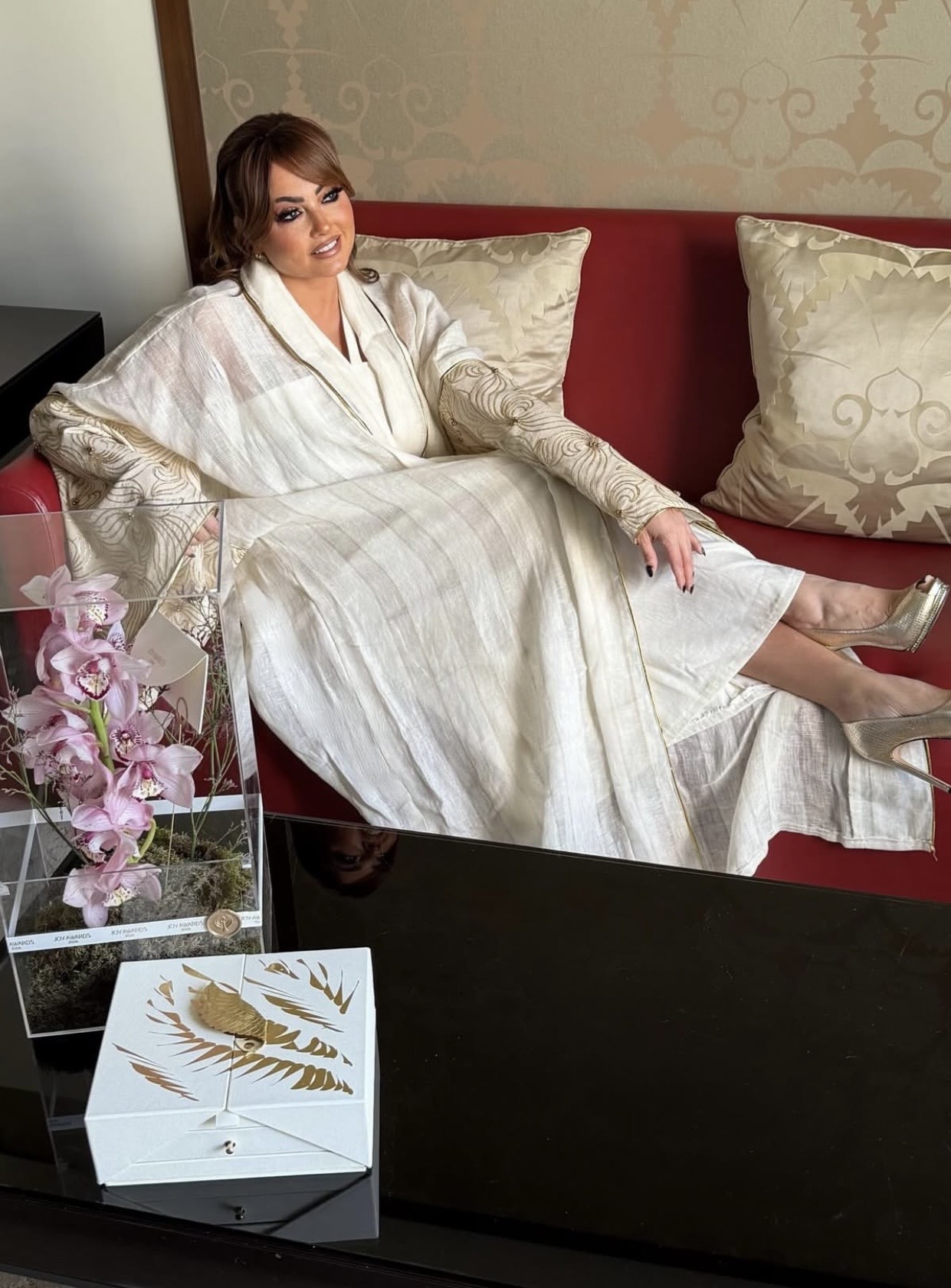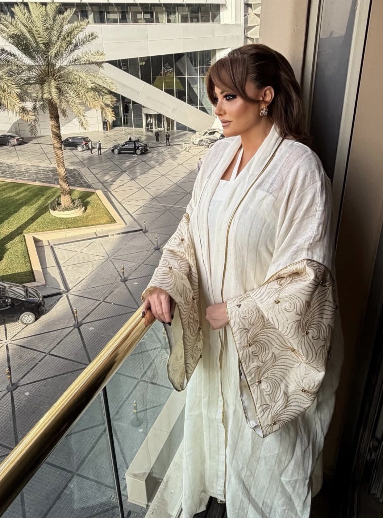 وجاءت العباءة بتصميم واسع، مع تطريزات ناعمة باللون الذهبي على الأكمام؛ ما أضفى لمسة أنثوية أنيقة على الإطلالة.