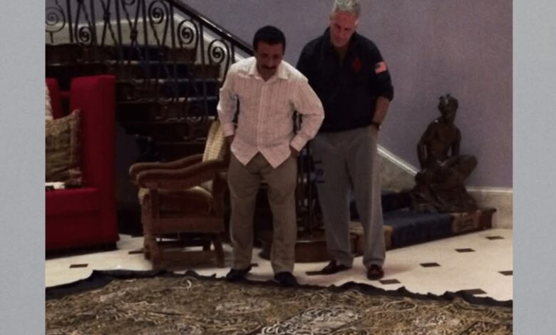 الوثيقة التي تحمل الرقم المرجعي (EFTA01201030) والرسائل المرتبطة بها، تظهر صورة صادمة لإبستين وهو يقف بجانب “سلطان أحمد بن سليم”، رئيس مجلس إدارة موانئ دبي العالمية، وهما ينظران ببرود إلى قطعة من كسوة الكعبة مطرزة بالذهب موضوعة على الأرض أسفل درج—وهو وضع يعتبر إهانة بالغة لقدسية هذه القطعة. المراسلات كشفت أن ثلاث قطع من الكسوة شُحنت جواً من السعودية إلى منزل إبستين في فلوريدا عام 2017 عبر وسطاء، من بينهم سيدة أعمال مقيمة بالإمارات تدعى “عزيزة الأحمدي” ورجل يدعى “عبد الله المعري”، وذلك بعد سنوات من تسجيل إبستين كمدان بالاعتداء الجنسي.
